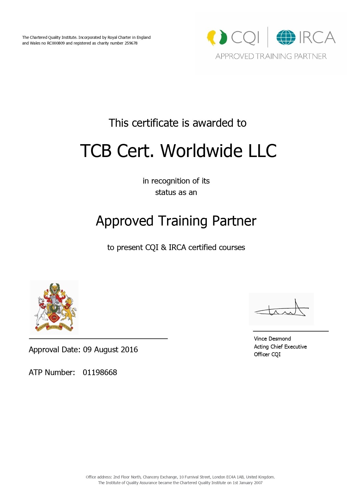 The Chartered Quality Institute (CQI) is incorporated by the Royal Charter in the United Kingdom. The International Register of Certificated Auditors (IRCA) is a division of the CQI, UK’s professional body for quality management professionals was formed in 1984 as part of the UK government’s initiative to make industry and business more competitive through the implementation of Quality principles and practice. The most respected body in the world for approval of management system auditor training organizations and Training courses. A Chartered body promoting quality worldwide for 100 years!